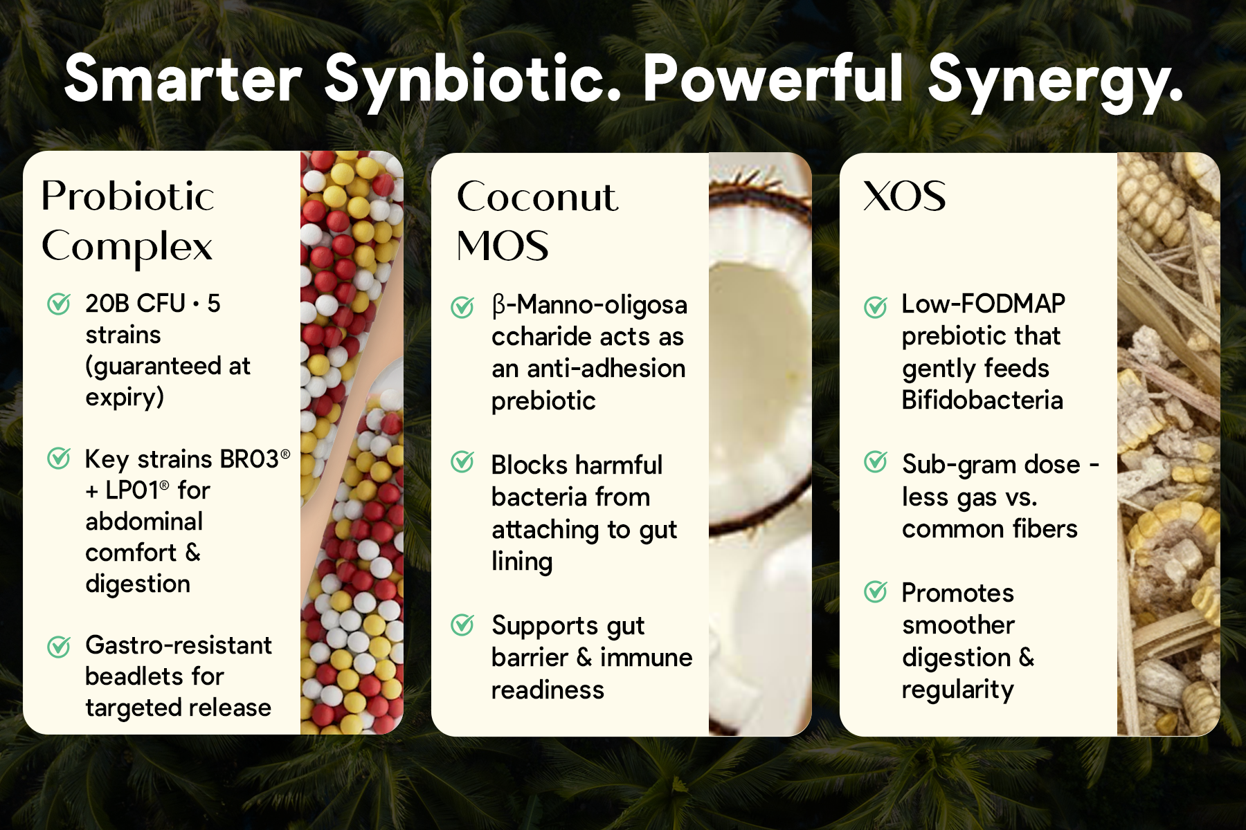 20B CFU multi-strain probiotics + XOS & Coconut MOS; shelf-stable, vegan